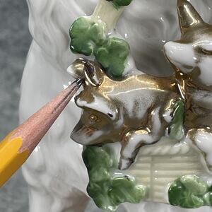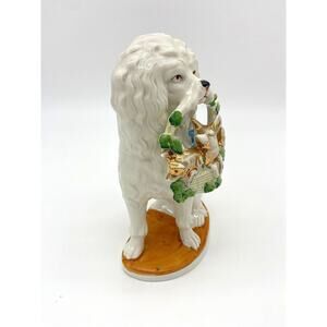 This is an antique German porcelain figurine depicting a poodle holding a basket of piglets. These figurines were popular in the late 19th and early 20th centuries.