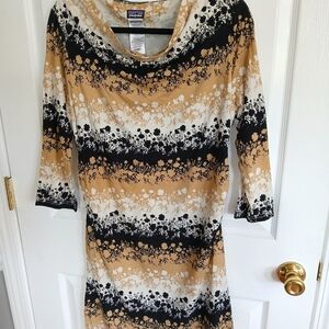 Patagonia Kamala Dress Sz L Black & Beige Floral Organic Cowl Neck Cotton Dress
