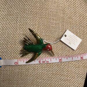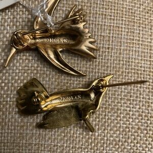 Elegant gold toned, hand enamel Hummingbird and Yellow Warbler bird limited edition brooch set from The Metropolitan Museum of Art by Ciner. Perfect for adding a touch of nature to any outfit. Pre-owned, good conditions.