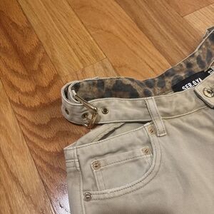 The SER.O.YA 27 Christy Straight Leg Jeans in Savannah Size 27 are a stylish and versatile addition to any woman's wardrobe. Made from 100% cotton denim with a solid stone wash, these beige jeans feature a unique belt loop design and a high-waisted, straight-leg fit. The jeans are accented with straps and a buckle, adding a trendy touch to the classic style. The regular size 27 waist and 29-inch inseam make these jeans a comfortable and flattering choice for everyday wear.