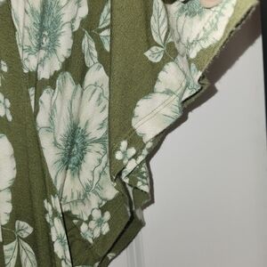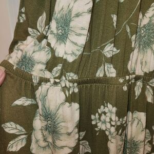 This Lane Bryant Dress Size 18/20 has a pretty olive green floral pattern. The V-Neck is elastic along with the waist. Fit & flare style with a flattering silhouette and a flared skirt. The elastic waist has a twist style belt and there are pockets. No closure, this is pullover style and very comfortable and soft. Throw on a jean jacket and you are good to go! Midi Length.