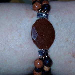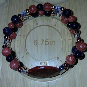 This elegant Handcrafted 6.75" Crystal bracelet features a stunning Focal of Genuine brown Goldstone with a combination of brown and blue Goldstone beads. The addition of copper makes this offering functional for fighting pain and perfect for adding a touch of sophistication to any outfit.