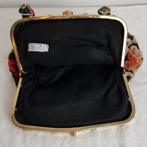 Vintage 50s 60s, Made in Hong Kong, raised fabric on a black background, Gold Frame & Hardware, Ring Lock closure, Black Cotton Lining with Single Pocket, Excellent Vintage Condition.