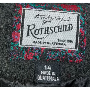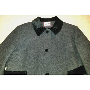 Girl's Coat-ROTHSCHILD- Wonderful girls gray 100% wool Edwardian-inspired coat with black velvet trim on the collar and pockets. Coat has a rounded neckline with a collar, full front button closures, two front pockets, long sleeves and is lined. 100% Wool. Marked Size: 14 (Underarm-to-Underarm= 19 1/2 inches, Length= 40 1/2 inches). Very good condition. Non-smoking home. Thanks for looking!