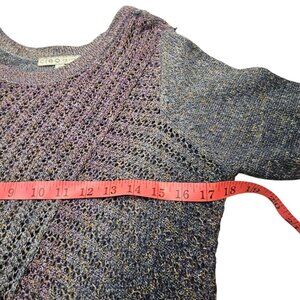 Soft sweater with open knit on front. Asymmetrical hem. Purple/Grey gradient. Materials tag is missing but I would assume it's a wool/acrylic blend. It is very soft.