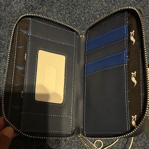 This Disney Loungefly wallet is in great condition. It’s been in storage for months and has never been used. It’s reasonably sized and features Mickey and his friends in their Halloween costumes on one side and ghost on the other. It has 4 slots for credit or debit cards, a pocket for cash or receipts, and a slot for your photo id. This wallet is the perfect gift for Disney lovers.
