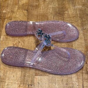 Embrace a touch of glamour with these Tory Burch sandals, featuring a shimmering pink glitter design. Crafted from translucent PVC, these sandals offer a chic and cohesive look with their glittery thong-style straps. Perfect for adding sparkle to any casual ensemble.