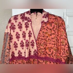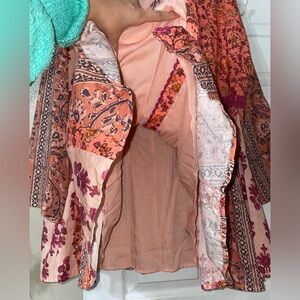 Really nice heavy material, but still flowy. 3 different patterns mixed together to give this really cool colorful vibe, all pink hues.