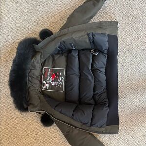 Chic Moose Knuckles Debbie bomber jacket. Olive green color with plush black fur details. Ideal for chilly weather. Rarely worn and in excellent condition.