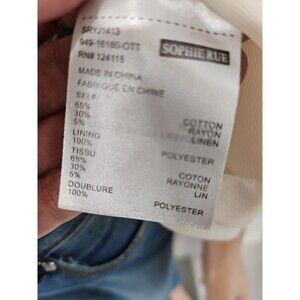 The Sophie Rue Blouse is a casual ivory blouse made of polyester with a cotton fabric type. It features a button accent, regular fit, and is designed for the summer and spring seasons. This blouse is perfect for a comfortable and stylish look, with a focus on the character Sophie and the brand Sophie Rue. this blouse is a versatile wardrobe staple for women's clothing in size M.