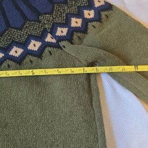 Stylish green sweater with navy and cream geometric patterns. Wider neckline. Cute with or without a tee underneath. No size label. Appears to be a Large or XL from the measurements. See all pictures for measurements. Perfect for cozy days.