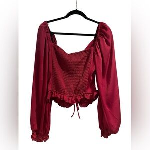 ASTR the Label Deep Pink / Red Long Sleeve Blouse Size Large NWT. Shirt has ruffle detailing. Elastic in shoulders and back of shirt. Color is a deep pink that can come off as red in certain lightings. New with tags.