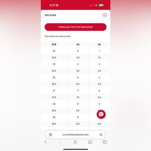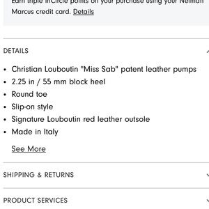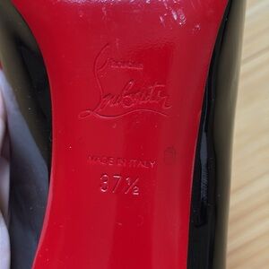 Christian Louboutin ‘Miss Sab’ black Patent leather Red Sole Pumps in size 37.5. These have a 55 mm heel, which is equal to about 2.25 inches. Classic style, as seen on Morgan Stewart! No box or dust bags. Light wear to soles and inners, a few small markings on patent leather as shown consistent with gentle wear. Size chart is direct from CL website.