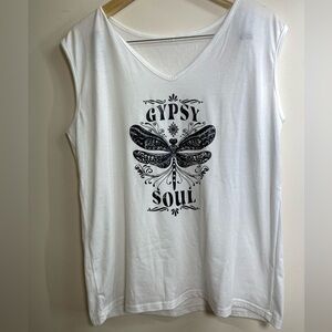 Gypsy Soul Graphic Tank Top in size Large. Perfect for those who love boho chic fashion, this top features a stylish “Gypsy Soul” design with a beautiful black dragonfly graphic on a crisp white background. Made from a comfortable blend of 95% polyester and 5% spandex, it offers a soft feel and a bit of stretch for the perfect fit. Whether you’re heading to a festival or enjoying a casual day out, this tank top will keep you looking effortlessly cool and stylish.