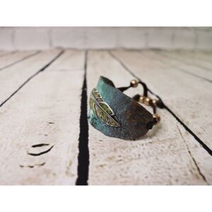 Features a patina leather with feather design, feather features mother of pearl inlay. Bracelet wrap is leather strapping with silver beads (they've oxidized a little).