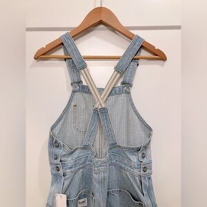 Slim flare leg gives a flattering, retro-inspired silhouette. Bib-and-brace design with adjustable crisscross straps for a custom fit. Plenty of storage with a functional bib pocket, chest pocket detail, and oversized front and back utility pockets. Subtle distressing throughout for that perfectly worn-in look.