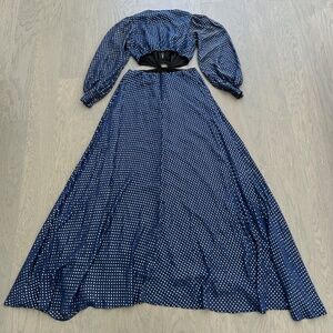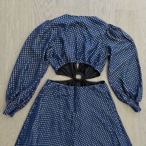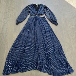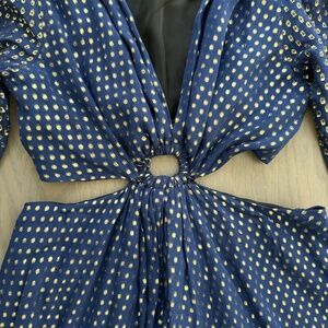 DELFI Collective Cerise Gown Blue Polka Dot Silk Metallic Gold Cut Out - Small
