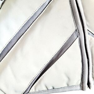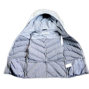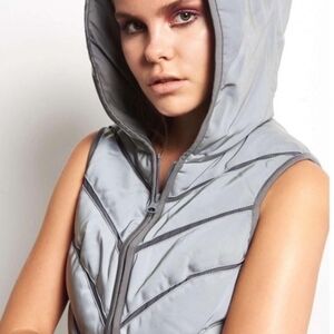 BLANC NOIR Reflective Grey / Gray & Silver Inset Mesh Puffer Vest w/ Hood. Zip Front, Zip Pockets. Perfect for Running / Jogging / Athletic / Activewear / Athleisure / Workout / Gym. Size Medium. Laid flat it measures approx. 18" armpit to armpit, 21" top shoulder to hem. Very good pre-owned condition w/ the exception of a few small areas on hood that reflective coating is chipped ( see close-up pic) Smoke/ Pet free environment. Bundle purchases to save greatly on shipping! #8/13