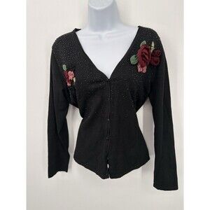 Vintage Tiara International Embroidered Cardigan Black Floral Sweater Womens M fairy dreamy sequins beautiful sweater
