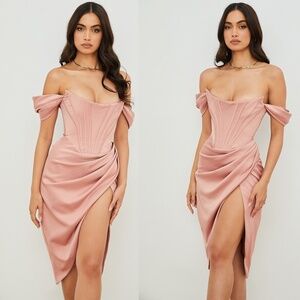 HOUSE OF CB | Luxury 'LORETTA' Satin Off Shoulder Dress in Blush Pink | Size XS