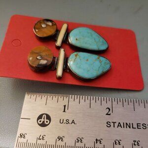 These interesting vintage turquoise earrings are signed/dated: McKeown 99. One post has some mild bending, but I left it alone because I, frankly, am a little scared of breaking it. As you can see, it's absolutely wearable with this minor bend. It was without backs, so they have been replaced with 925 sterling.