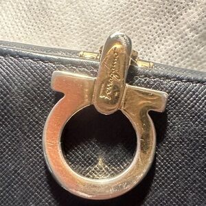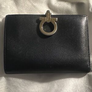 Elegant black leather wallet featuring silver hardware. Perfect for any occasion. Unisex. Women’s or men’s. In very good used condition. No rips no tears no stains and no smells. Salvador Ferragamo.