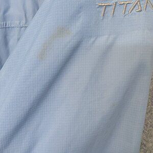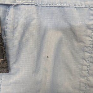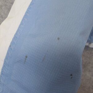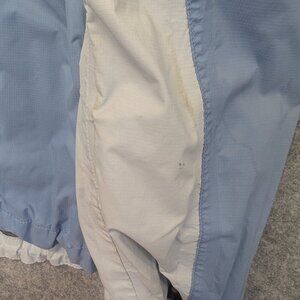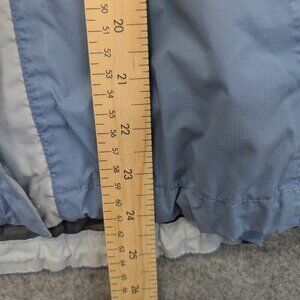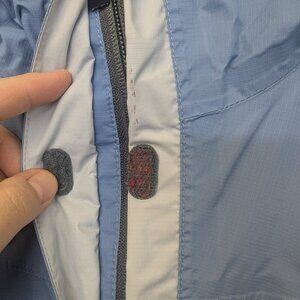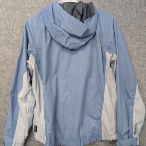 This light blue Columbia Sportswear jacket is perfect for outdoor adventures! Featuring a full zip, zippered hand pockets, and a stowaway hood, it offers both practicality and style. The contrasting light grey panels add a nice touch, making it a versatile piece for your wardrobe.