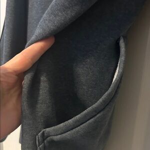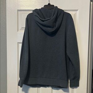 Charcoal hoodie featuring iconic black stripes. Includes front pockets and a zip closure.