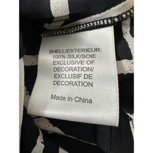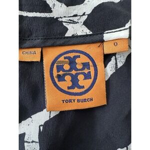 The Tory Burch 100% Silk Top in women's size 0 is a stylish and elegant piece perfect for a career or designer look. This long sleeve blouse features an abstract black and white pattern, a zip closure for convenience, and is made from luxurious silk material. The classic design and colorful theme make it a versatile and eye-catching addition to any wardrobe. Crafted by the renowned brand Tory Burch, this top combines quality craftsmanship with a timeless and trendy style, suitable for various occasions.