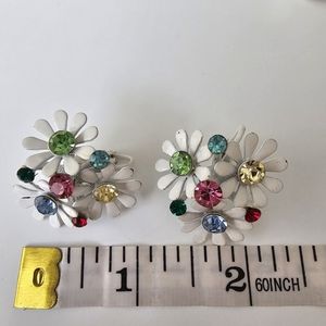 Vintage White Enamel Daisies Flower Colorful Rhinestones clip on earrings