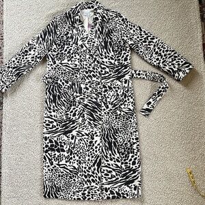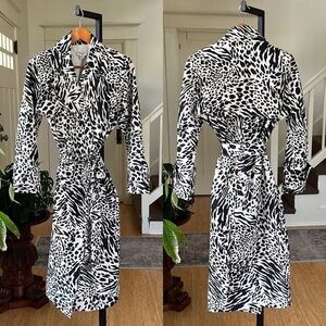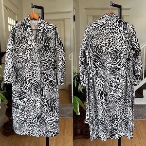 Black and white animal print with hand pockets, back vent and padded shoulders. Button front with self tie closure and belted sleeves. Lined at top only.