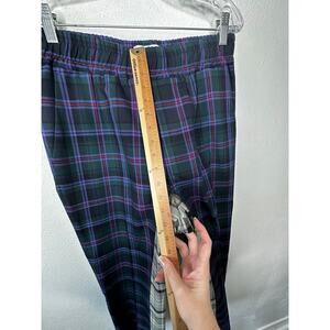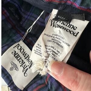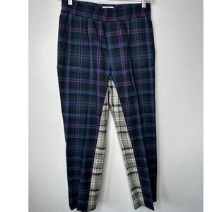 Stand out in bold British style with this Vivienne Westwood tailored tartan suit set. Crafted in Italy from 100% virgin wool, the structured jacket features sharp lapels, and sleek pocket detailing in a rich green, purple, and red tartan pattern. Paired with coordinating elastic waist pants featuring an unexpected contrasting beige plaid insert down the inner leg, this set delivers iconic Westwood attitude with refined tailoring. Jacket is marked size 52, pants size 50. Original retail $3,650.
