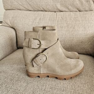 Sorel Joan Of Arctic Leather Wedge II Buckle Boot. Womens size 7.5. New with tags. Criss-cross buckles made this wedge ankle bootie a must-have for the season. Featuring waterproof full-grain leather for city showers, a side zipper for easy on-and-off, the design is in the details. Walk hours and hours in the comfortable EVA footbed and stand tall with the grippy rubber sole.