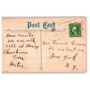 Printed on standard 5.5 x 3.5 inch paper, this original postcard dates to the early 20th century, evidenced by the 1-cent U.S. postage stamp and postmark from December 1913. The back includes a handwritten holiday message and address, adding to its authentic collectible appeal. This piece is perfect for collectors of antique Christmas postcards or those who appreciate religious and seasonal ephemera with historical significance.