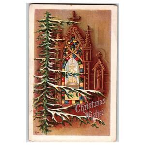 Vintage Embossed Christmas Postcard Stained Glass Church Window
