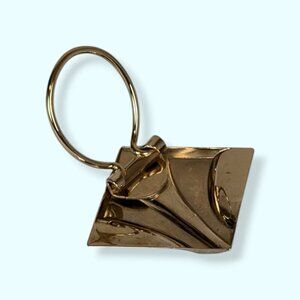 This vintage clip is made of a gold tone metal and has a round clip on the back. The clip is diamond shaped and has a symmetrical wave across the front. The piece can be clipped onto a scarf, the top of a collar, on a bag, or wherever you like. There is normal wear, including some superficial marks in the surface of the metal.