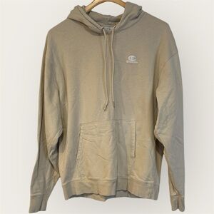 Stylish beige hoodie with a front pocket. Features a drawstring hood and Champion logo.