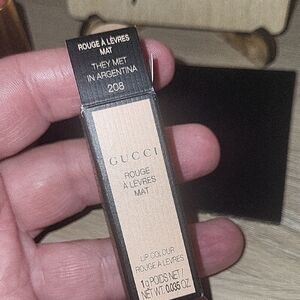 Indulge in Gucci's luxurious matte lipstick. Soft coral shade for a chic look.