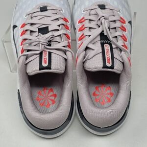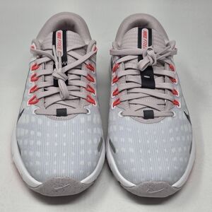 Stylish gray and red athletic shoes with a sleek design. Features a prominent Nike logo.