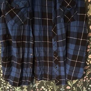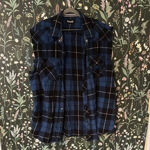 Blue and black plaid shirt, sleeveless button down top, casual flannel style, grunge-inspired fashion, laid-back everyday wear, cozy soft cotton feel, edgy streetwear look, classic lumberjack plaid, relaxed fit shirt, vintage-inspired vibes, 90s nostalgia aesthetic, alternative casual outfit, rocker chic style, whimsical grunge layering piece, unisex relaxed top, festival-ready fashion, dark academia casual wear, versatile wardrobe staple, effortlessly cool flannel, rustic outdoor look, edgy boho charm, comfy and breathable design, bold plaid pattern, timeless casual classic