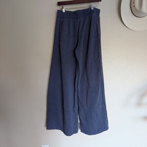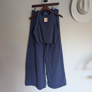 Ribbed fabric with lots of stretch. Cropped fp tank with flowy wide leg pants.