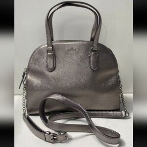 Material and Color: Made of leather in a gunmetal/silver tone.