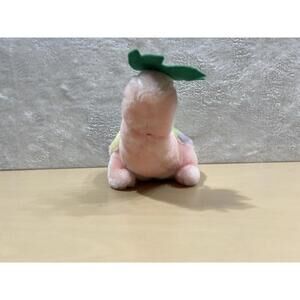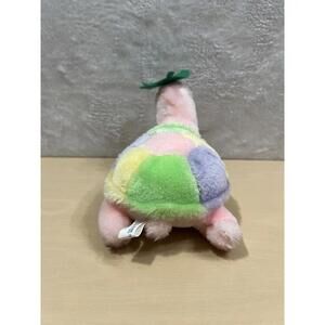 Adorable FLOMO Kids pastel plush turtle measuring approximately 8 inches long. Features a soft multicolor patchwork shell, pink body, and a cute green felt leaf hat attached to the head. Clean and in great pre-owned condition with no stains or tears.