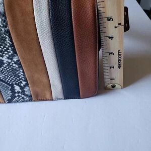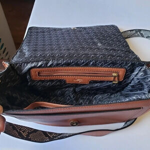Sammy Aubrey Crossbody Bags Organize , Back flap pocket Magnetic snap cover flap with faux crocodile, suede and snakeskin stripes Inner zip pocket and flap pocket in main compartment Flap pocket Faux leather shoulder strap with faux snakeskin finish on one side.color conac in great condition from smoke and pet free home.b.15