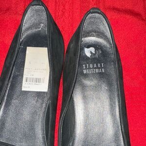 So cute! Step out in style with these elegant black Stuart Weitzman loafers featuring chic silver accents. Perfect for any occasion, these shoes offer both comfort and sophistication.