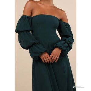 Demure Aura Emerald Tiered Balloon Sleeve Off The Shoulder Dress from Lulus. Dramatic front slit. Back zip entry.