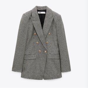 NWT Zara Black and White Double Breasted Houndstooth Blazer with Gold Buttons