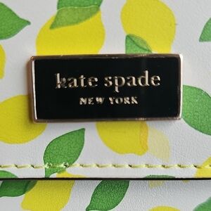 NWT Chic crossbody bag with vibrant lemon print. Features white background with yellow lemons and green leaves. Iconic Kate Spade logo on front.