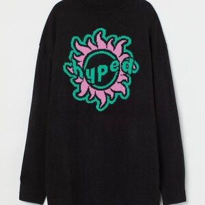 Black sweatshirt with a colorful Hype graphic. Features pink and green design.