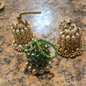These beautiful handmade vintage ornaments feature a stunning array of gold, green, blue, and red beads, perfect for adding a touch of elegance to any tree, large or small. There are one dozen of them.